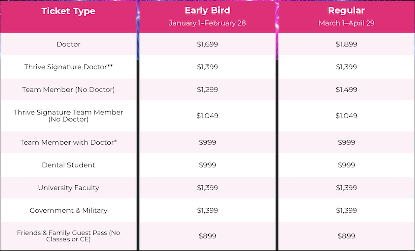 Groups of 10 or more enjoy a special 10% volume discount. Email us at thriveliveevent@henryschein.com for more details.